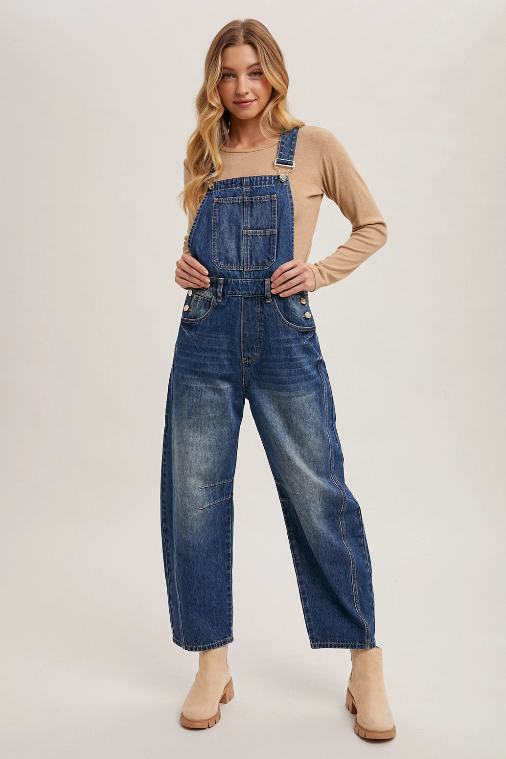 Denim barrel overalls offer a modern twist on the classic overall design, featuring a relaxed, wide-leg silhouette that provides both style and comfort. The barrel shape of the legs creates a unique, voluminous look, while the adjustable straps and bib front maintain the traditional overall aesthetic. Made from sturdy denim, these overalls are designed for durability and casual wear. Functional pockets add practicality, making them perfect for everyday outfits. These versatile overalls can be dressed up with a fitted top or kept casual with a simple tee for a laid-back, stylish vibe. -Model is 5'9" and wearing a Small