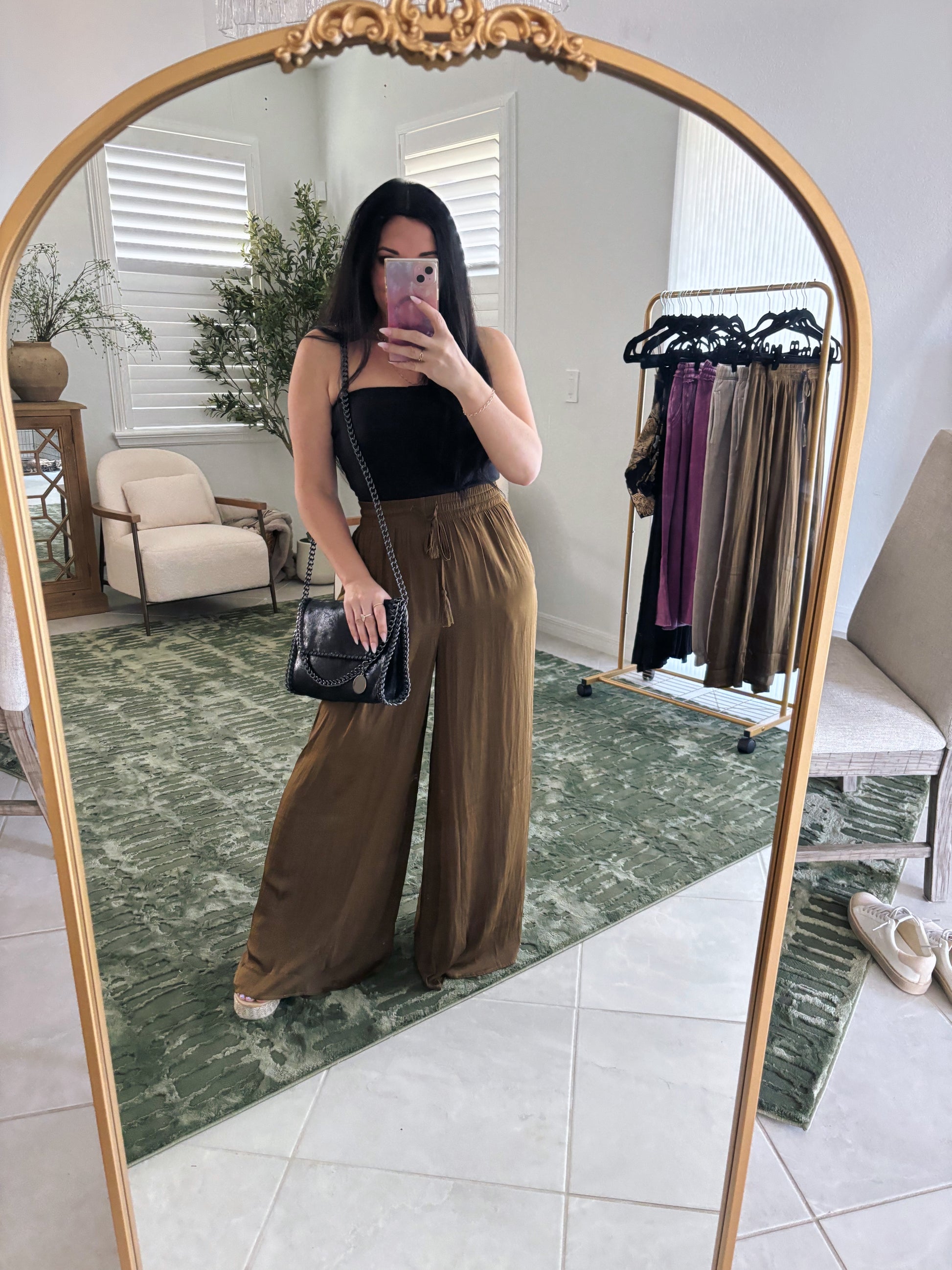 Float through your day in these effortlessly chic and comfortable palazzo pants. Crafted from a lightweight, silky fabric, they feature a dramatic, wide-leg silhouette that flows with every step. The high, elasticated waistband ensures a perfect fit, while the matching drawstring, complete with charming tassels, adds a touch of bohemian flair. Finished with practical side pockets, these versatile pants are perfect for creating an elegant, breezy look for any occasion.