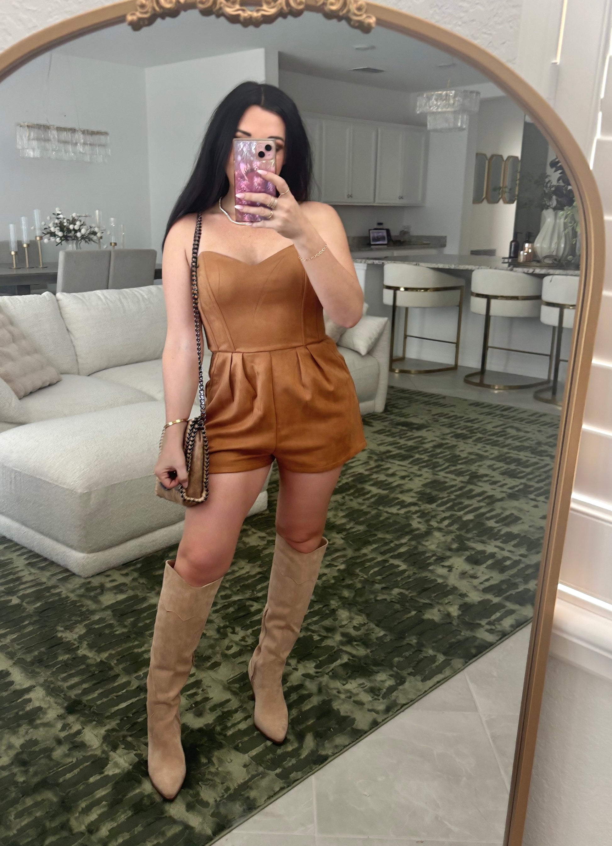 Step into cozy-chic with our Suede Dream Romper! This strapless sweetheart cutie hugs in all the right places with a structured bodice and playful pleated shorts that twirl with every step. Pair it with boots and some accessories and you’re ready for a night out or a concert! Its giving luxe cowgirl meets city brunch vibes. Perfect for golden hour selfies and sunset dates—your new fall fave just dropped! 🍂✨